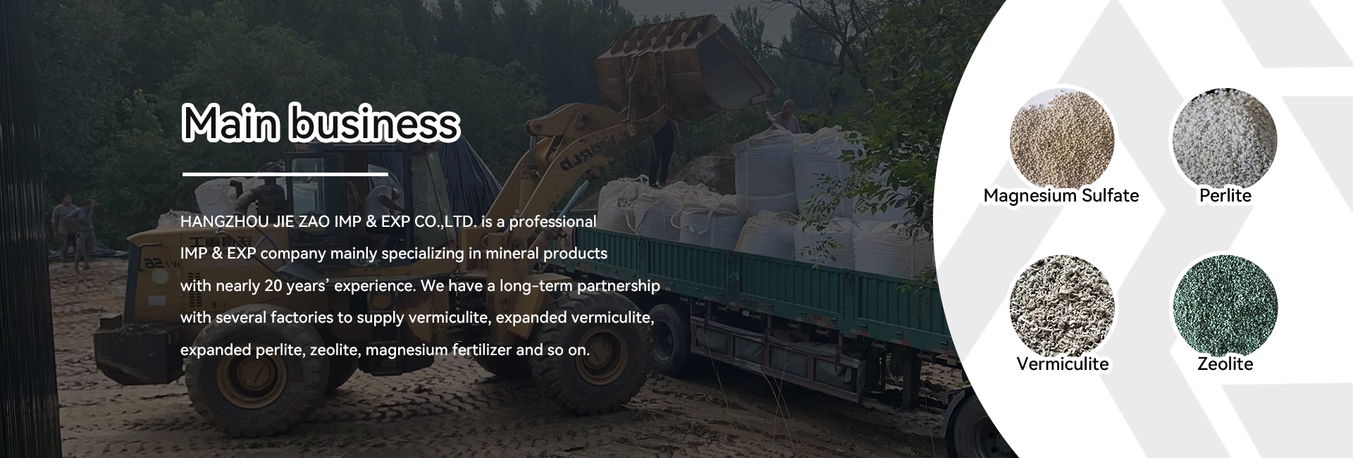 HANGZHOU JIE ZAO IMP & EXP CO.,LTD. is a professional IMP & EXP company mainly specializing in mineral products with nearly 20 years’ experience. We have a long-term partnership with several factories to supply vermiculite, expanded vermiculite, expanded perlite, zeolite, magnesium fertilizer and so on. The supply ability of the factories can make the demands of the use of the products for various quality and specifications. We have strict test to ensure the quality of our products. We now mainly cover the market of Japan, serve with several big customers, with the swallowing approx. 16 containers per month and we are expanding our market. By thoughtful service, reasonable price, excellent quality and on-time delivery, the company has gotten high praise from both domestic and foreign markets. In the face of future development, we will always dedicate ourself to do business with marketers from all over the world, to make value for both of us.